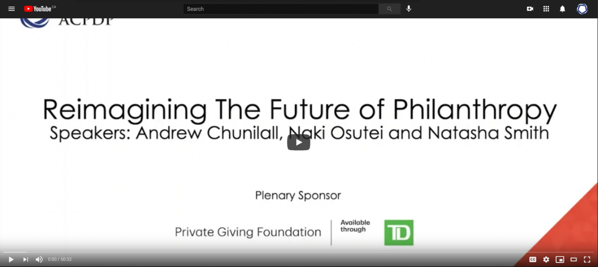 The closing plenary of the conference featured three thought leaders on the idea of reimagining the future of philanthropy. With their powerful words and ideas Andrew Chunilall, CEO of Community Foundations Canada, Naki Osutei, Associate Vice President, Social Impact (Canada) for the Global Corporate Citizenship department at TD Bank, and Natasha Smith, Partner with Miller Thompson LLP and a member of their Social Impact Group moved our audience in such a way that once again we were overwhelmed with requests to make their compelling presentations publicly available. Today we are pleased to do so.