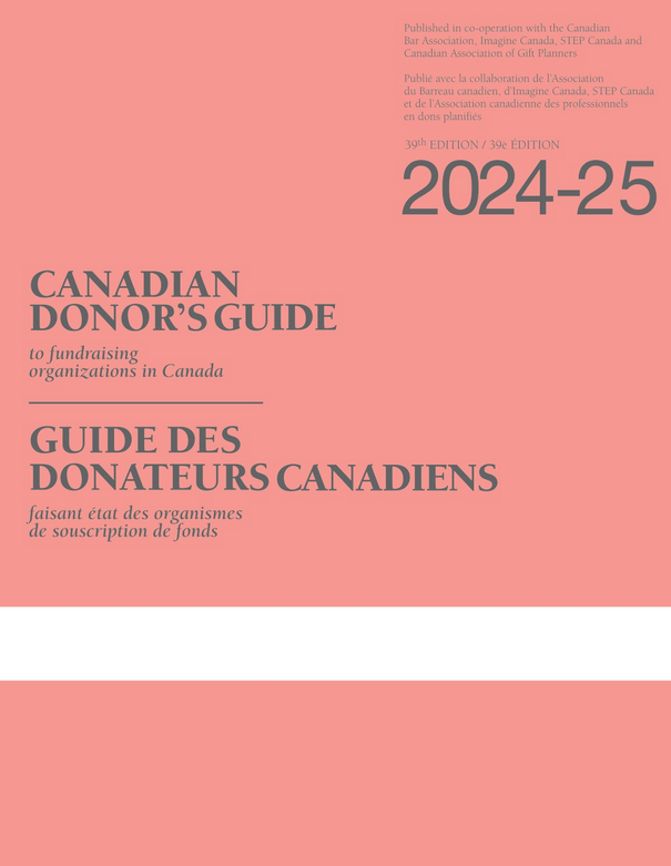 Canadian Donors Guide Receive a free annual hard copy of the directory to Canadian fundraising organizations. Professional advisors, their clients, corporations and foundations use it for gifting and other donation decisions. |