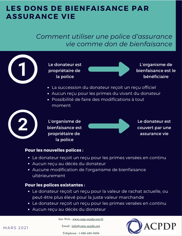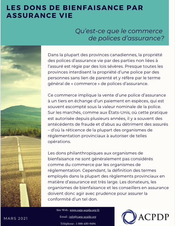 Au cours des dernières années, des organismes de réglementation du secteur de l’assurance ont exprimé leurs préoccupations sur l’utilisation de produits d’assurance vie comme dons de bienfaisance. Il a donc été recommandé que les parties intéressées établissent des meilleures pratiques pour assurer que des mesures et processus appropriés sont adoptés pour ces dons.