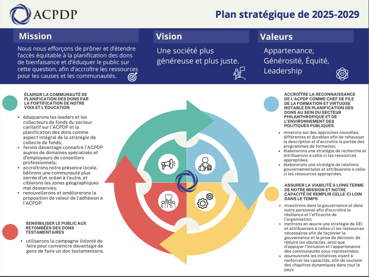 Notre nouvelle mission consiste à prôner et étendre l’accès équitable à la planification des dons de bienfaisance et à éduquer le public sur cette question, afin d’accroître les ressources pour les causes et les communautés.